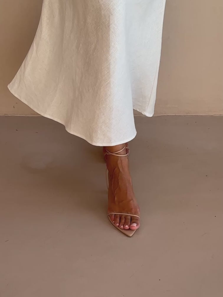 Our HARLO nude heels feature soft tie up straps, a padded sole, pointed toe and a mid heel stiletto.