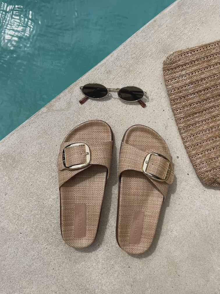 Our CAYO slide sandals feature a chunky yet lightweight sole, a supportive footbed and strap with oversized gold buckle.